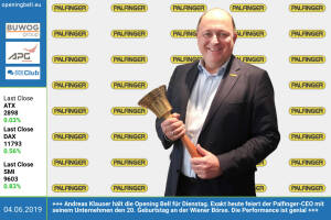 4.6..: Andreas Klauser läutet die die Opening Bell für Dienstag. Der Palfinger-CEO feiert mit seinem Unternehmen den 20. Geburtstag an der Wiener Börse, dieser ist exakt heute.. Die Performance ist genial http: www.palfinger.com www.facebook.com groups GeldanlageNetwork 3.6.: Matthias Strolz läutet die Opening Bell für Montag. Morgen Dienstag startet der Ex-Neos-Chef seine 2. TV-Karriere. Die Premiere erfolgt mit „Strolz trifft Nonne“ um 21.50 Uhr auf Puls4 www.puls4.com http: www.strolz.eu www.facebook.com groups GeldanlageNetwork 31.5.: Günther Matzinger läutet die Opening Bell für Freitag. Der Ex-Banker und Paralympics-Champ holte sich für seine Corporate-Fitness-App windhund 360.000 Euro von Business Angels. 2016 wurde G&u... » Weiterlesen