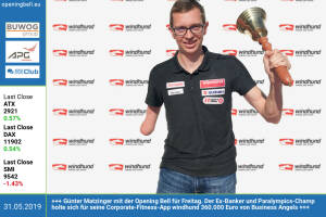 31.5.: Günther Matzinger läutet die Opening Bell für Freitag. Der Ex-Banker und Paralympics-Champ holte sich für seine Corporate-Fitness-App windhund 360.000 Euro von Business Angels. 2016 wurde Günther unser "Rookie of the year" beim Business Athlete Award, siehe photaq.com page pic 59083 . www.windhund.com de www.facebook.com groups GeldanlageNetwork 29.5.: Klaus Ofner mit der Opening Bell für Mittwoch. Wienerbergers IR-Chef bekam vom Magazin "Institutional Investor" für sich und sein Team eine Reihe von internationalen IR-Awards http: www.wienerberger.com www.facebook.com groups GeldanlageNetwork 28.5.: Herta Stockbauer läutet die Opening Bell für Dienstag. Als CEO der BKS ist sie heute Host und Startspeakerin der Börse Social ... » Weiterlesen