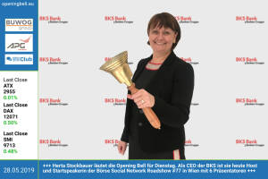29.5.: Klaus Ofner mit der Opening Bell für Mittwoch. Wienerbergers IR-Chef bekam vom Magazin "Institutional Investor" für sich und sein Team eine Reihe von internationalen IR-Awards http: www.wienerberger.com www.facebook.com groups GeldanlageNetwork 28.5.: Herta Stockbauer läutet die Opening Bell für Dienstag. Als CEO der BKS ist sie heute Host und Startspeakerin der Börse Social Network Roadshow #77 in Wien mit 6 Präsentatoren http: www.bks.at http: www.boerse-social.com roadshow (Anmeldung geschlossen) 27.5.: Kantig läutet die Opening Bell für Montag. Die Band von DiaDorn-Inhaber Fabian Werner alias Peter releaste vor wenigen Tagen "Discofox" www.youtube.com watch?v=b6G8nKUGiLI . DiaDorn ist Hersteller für kleine und mittlere Einw... » Weiterlesen