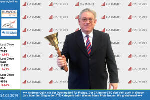 24.5.: Andreas Quint mit der Opening Bell für Freitag. Der CA Immo-CEO darf sich auch in diesem Jahr über den Sieg in der ATX-Kategorie beim Wiener Börse Preis freuen. Wir gratulieren! http: caimmo.com www.facebook.com groups GeldanlageNetwork 23.5.: Sabine Gstöttner (li.) läutet mit Karl und Barbara die Opening Bell für Donnerstag. Es ist zugleich die Opening Bell für ein Kochbuch. Ein Börserezept wird dabei sein, ev. mit einer Outdoor-Variante von http: www.boerse-social.com roadshow als Start http: www.inspirin.at www.treffpunktessling.at www.facebook.com groups GeldanlageNetwork Bilder siehe photaq.com page index 3635 22.5.: Helmut Fallmann läutet die Opening Bell für Mittwoch. Der Fabasoft-Vorstand verlautbarte gestern de... » Weiterlesen