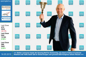16.5.: Walter Larionows läutet die Opening Bell für Donnerstag. Als Head of Sales & Customer Relations der Hello bank! lädt er heute morgen zum grossen B2B-Kongress seines Hauses http: www.hellobank.at www.facebook.com groups GeldanlageNetwork 15.5.: Vanda Pomberger läutet die Opening Bell für Mittwoch. Vor kurzem eröffnete sie das "Zweitoutfit" in Tulln und bietet Designerkleidung, Neu & Secondhand sowie preiswerte Mode www.facebook.com Zweitoutfit-eu-616835312112018 www.facebook.com groups GeldanlageNetwork 14.5.: Hannes Bardach mit der Opening Bell für Dienstag. Der Frequentis-Gründer läutet damit die Börsenotiz in Wien und Frankfurt ein. Der Erstkurs an der Wiener Börse lag bei 18,10 Euro www.frequentis.com www.... » Weiterlesen