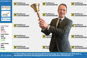 20.12.: Bernd Maurer läutet die Opening Bell für Donnerstag. Der Chefanalyst der RCB sieht zu Jahresbeginn durchaus Erholungspotenzial für den heimischen Aktienmarkt. http: rcb.at www.facebook.com groups GeldanlageNetwork 19.12.: Manuel Feller läutete die Opening Bell für Mittwoch. Der ÖSV-Star schaffte sich danach im 1. DG des RTL von Saalbach (Saalbach ziert auch Fellers Kappl) ein feine Ausgangsposition http: www.oesv.at www.facebook.com search top ?q=sportsblogged http: www.runplugged.com 18.12.: Lukas Reiter läutet die Opening Bell für Dienstag. Der Account Manager bei der EQS Group AG kommuniziert laufend mit der österreichischen Investor Relations-Szene. www.eqs.com de de www.facebook.com groups GeldanlageNetwork 17.12.: Thoma... » Weiterlesen