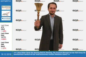 18.12.: Lukas Reiter läutet die Opening Bell für Dienstag. Der Account Manager bei der EQS Group AG kommuniziert laufend mit der österreichischen Investor Relations-Szene. www.eqs.com de de www.facebook.com groups GeldanlageNetwork 17.12.: Thomas Steinberger läutet die Opening Bell für Montag. Der CIO von Spängler IQAM Invest rät Anlegern, in 2019 auf europäische Aktien und Emerging Markets-Anleihen zu setzen. http: www.iqam.com www.facebook.com groups GeldanlageNetwork 14.12.: Toni Pfeffer läutet die Opening Bell für Freitag. Beim am Sonntag bevorstehenden Derby gegen Rapid stehen beide Wiener Großclubs unter Druck, nur ein Sieg zählt für das Playoff http: fk-austria.at http: www.runplugged.com 13.12.: Maria Jelen... » Weiterlesen