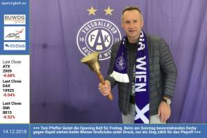 14.12.: Toni Pfeffer läutet die Opening Bell für Freitag. Beim am Sonntag bevorstehenden Derby gegen Rapid stehen beide Wiener Großclubs unter Druck, nur ein Sieg zählt für das Playoff http: fk-austria.at http: www.runplugged.com 13.12.: Maria Jelenko läutet die Opening Bell für Donnerstag. Die Online-Chefin von Heute.at hat neben ihrem Job einen spannenden Polit-Krimi herausgegeben: Volkszählung. http: www.maria-jelenko.at http: www.heute.at www.facebook.com groups GeldanlageNetwork 12.12.: Wolfgang Deutschmann läutet die Opening Bell für Mittwoch. Der Gründer der Rocket Crowdinvesting-Plattformen startet auf Green Rocket heute mit Exytron eine neue Kampagne. www.greenrocket.com www.facebook.com groups GeldanlageNetwork ... » Weiterlesen