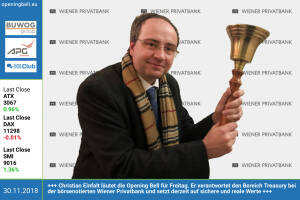 30.11.: Christian Einfalt läutet die Opening Bell für Freitag. Er verantwortet den Bereich Treasury bei der börsenotierten Wiener Privatbank und setzt derzeit auf sichere und reale Werte. http: wienerprivatbank.com www.facebook.com groups GeldanlageNetwork 29.11.: Lina Mosentseva läutet die Opening Bell für Donnerstag. Die Web Designerin und Content Developerin bei Ritschy Dobetsbergers sotrawo sorgte für Österreich-Präsenz auf der WoT http: www.sotrawo.com www.wot-messe.de home www.facebook.com groups GeldanlageNetwork 28.11.: Vorstandsmitglied Helmut Bernkopf läutet die Opening Bell für Mittwoch. Die OeKB unterstützt mit ihren Produkten den Wachstumskurs österreichischer Unternehmen und ist bei Geschäften im Ausland ... » Weiterlesen