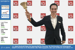27.11.: Salah Bouhmidi läutet die Opening Bell für Dienstag. Der Marktanalyst mit Schwerpunkt DailyFX informiert im IG-Newsletter über Währungspaare, aber auch zB Bitcoin und Indizes www.facebook.com groups GeldanlageNetwork 26.11.: Johannes Osrael läutet die Opening Bell für Montag. Der Ex-TeleTrader Geschäftsführer leitet nun beim S&P500 Medizintechnik-Unternehmen BD in Wien die techn. Entwicklung. http: www.bd.com www.facebook.com groups GeldanlageNetwork 23.11. : Madlen Stottmeyer läutet die Opening Bell für Freitag. Die Wirtschaftsjournalistin moderierte dieser Tage die von Wirtschaftsagentur und Bankenverband initiierte „Fintech Week Vienna“ 22.11.: Julian Wöhrle und Christoph Thurnberger mit der Opening... » Weiterlesen