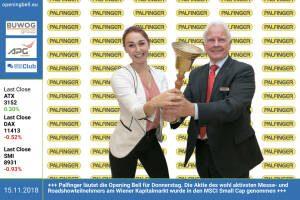 15.11.: Palfinger läutet die Opening Bell für Donnerstag. Die Aktie des wohl aktivsten Messe- und Roadshowteilnehmers am Wiener Kapitalmarkt wurde in den MSCI Small Cap genommen http: www.palfinger.com www.facebook.com groups GeldanlageNetwork 14.11.: Michael Trcka mit der Opening Bell für Mittwoch. Der CFO der W.E.B Windenergie AG hat sich im Herbst über Anleihen 15 Mio. Euro geholt und auch einen PV-Park in Italien erworben. www.windenergie.at www.facebook.com groups GeldanlageNetwork 13.11.: Edda Vogt läutet die Opening Bell für Dienstag. Als Editor-in-Chief der Börse Frankfurt outete sie gestern "ein Projekt, das mir persönlich wichtig war": http: boerse-frankfurt.de greenbonds . Mit dabei u.a. Bonds von RBI und Verbund. www.facebook.com grou... » Weiterlesen