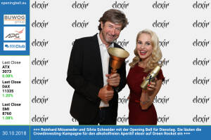 30.10.: Reinhard Möseneder und Silvia Schneider mit der Opening Bell für Dienstag. Sie läuten die Crowdinvesting-Kampagne für den alkoholfreien Aperitif elexir auf Green Rocket ein. www.greenrocket.com www. facebook .com groups GeldanlageNetwork 29.10.: Felix Strohbichler mit der Opening Bell für Montag. Der Palfinger -CFO hat 9-Monats-Zahlen mit einem Umsatz von 1,18 Mrd. Euro und einem EBIT von 101,7 Mio. Euro bekanntgegeben www.palfinger.ag ht tps: www.facebook.com groups GeldanlageNetwork 25.10.: Anna Veith läutet die Opening Bell für Donnerstag. Am Wochenende heisst es für die wiedererstarkte Ex-Weltcupsiegerin "Saisonauftakt in Sölden". Wir wünschen viel Erfolg für die Saison 2018 19 http: www.anna-veith.com http: www.sporthil... » Weiterlesen