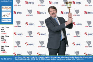 12.10.: Ernst Vejdovszky mit der Opening Bell für Freitag. Der S Immo-CEO gibt damit den Startschuss für die Aktientrophy 2018. Ab 18.30 Uhr kann getippt werden, es winken tolle Preise. aktientrophy.at www.facebook.com groups GeldanlageNetwork 11.10.: Randolf Fochler läutet die Opening Bell für Donnerstag. Scholdan & Company betreut u.a. das ZFA, unter http: www.zertifikateforum.at wissen trend-des-monats gibt es ein neues Umfragetool www.facebook.com groups GeldanlageNetwork 10.10.: Erwin Hof läutet die Opening Bell für Mittwoch. Der Leiter der Financial Literacy-Aktivitäten der Wiener Börse ist u.a. seit 2005 für die Wiener Börse Akademie samt Lehrinhalten zuständig. Neu im Programm: Dividendenstrategien, Handel mit Kr... » Weiterlesen