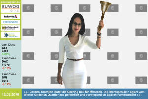 12.9.: Carmen Thornton läutet die Opening Bell für Mittwoch. Die Rechtsanwältin agiert vom Wiener Goldenen Quartier aus persönlich und vorwiegend im Bereich Familienrecht www.thornton-law.at www.facebook.com groups GeldanlageNetwork 11.9.: Karl-Heinz Strauss und Michael Ludwig läuten die Opening Bell für Dienstag. Der Porr -CEO und Wiens Bürgermeister wollen junge Menschen für die Bauwirtschaft begeistern. Der Grundstein für den Porr Ausbildungscampus wurde gelegt http: porr.at www. facebook .com groups GeldanlageNetwork 10.9.: 5er-Bell für das WEP SA-Listing: Martin Wenzl ( Wiener Börse), Adrian Fuhrmeister (Capital Lounge), Ioannis Sompolos (WEP SA), Gabriel Kiranoglu (Capital Lounge), Alexander Coenen ( Signature AG ... » Weiterlesen