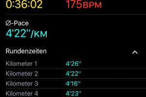 Wie gestern ein guter Vormittagslauf, Pace 4:22 auf 8 Kilometer. Ich schaue derzeit vor allem, dass ich das Tempo recht hochhalte und ein wenig an der Lauftechnik feile. Wirklich auf Kilometer kommen kann ich aus Zeitgründen nicht, Longruns gehen sich nicht mehr aus, aber das macht nichts. Aktivität: Lauf Dauer: 00:36:02 Distanz: 8 230 Pace: 04:22 km h: 13.74 Schuhe: Brooks App: Runplugged Uhr: Apple Watch Runkit rechnet: Christian ist im September bisher 25,240 km gelaufen, im Schnitt täglich 2,804 km, ein Plus von 20,23 Prozent gegenüber dem August, als Christian 2,333 km Tagesschnitt hatte. Christians Top-Monat bisher: Juli 2017 mit 10,433 km täglich. >> Zum Runkit Profil von Christian Drastil Weitere Einträge bzw. selbst gr... » Weiterlesen