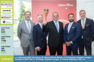 10.9.: 5er-Bell für das WEP SA-Listing: Martin Wenzl ( Wiener Börse), Adrian Fuhrmeister (Capital Lounge), Ioannis Sompolos (WEP SA), Gabriel Kiranoglu (Capital Lounge), Alexander Coenen (Signature AG) http: www.fiveoliveoil.com about-wep-sa www.facebook.com groups GeldanlageNetwork 7.9.: Markus Niederreiner läutet die Opening Bell für Freitag. Der Managing Director des grössten Austro-Brokers Hello bank! wünscht den Anlegern einen erfolgreichen Herbst http: www.hellobank.at www.facebook.com groups GeldanlageNetwork 6.9. : Alfred Felder läutet die Opening Bell für Donnerstag. Der CEO von Zumtobel fokussiert sich bei der Neuausrichtung auf die Kernkompetenzen des Unternehmens http: zumtobelgroup.com www.facebook.com groups GeldanlageNetw... » Weiterlesen