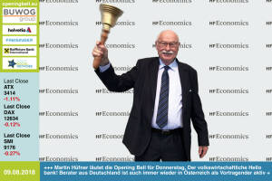 9.8.: Martin Hüfner läutet die Opening Bell für Donnerstag. Der volkswirtschaftliche Hello bank! Berater aus Deutschland ist auch immer wieder in Österreich als Vortragender aktiv #30JahreDAX 8.8.: Christoph Boschan läutet die Opening Bell für Mittwoch. Der deutsche CEO der Wiener Börse AG beschliesst unsere Bell-Serie "30 Deutsche an 30 Tagen zu #30JahreDAX" http: www.wienerborse.at www.facebook.com groups GeldanlageNetwork #goboersewien 7.8.: Frank Dumeier mit der Opening Bell für Dienstag. Der W.E.B-CEO startet damit die Green Power Anleihen, die Zeichnungsfrist beginnt heute und by the way gratuliert er zu#30JahreDAX. www.windenergie.at page.asp - index.htm www.facebook.com groups GeldanlageNetwork #goboersewien 6.8.: Heiko Thieme lä... » Weiterlesen
