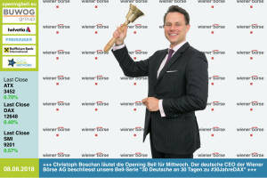 8.8.: Christoph Boschan läutet die Opening Bell für Mittwoch. Der deutsche CEO der Wiener Börse AG beschliesst unsere Bell-Serie "30 Deutsche an 30 Tagen zu #30JahreDAX" http: www.wienerborse.at www.facebook.com groups GeldanlageNetwork #goboersewien 7.8.: Frank Dumeier mit der Opening Bell für Dienstag. Der W.E.B-CEO startet damit die Green Power Anleihen, die Zeichnungsfrist beginnt heute und by the way gratuliert er zu#30JahreDAX. www.windenergie.at page.asp - index.htm www.facebook.com groups GeldanlageNetwork #goboersewien 6.8.: Heiko Thieme läutet die Opening Bell für Montag. Eine #30JahreDAX -Strecke mit 30 Gratulanten darf es im Grunde ohne ihn eigentlich nicht geben. Gibt es daher auch nicht www.heiko-thieme.club www.facebook.com groups Geldanla... » Weiterlesen