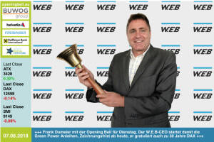 7.8.: Frank Dumeier mit der Opening Bell für Dienstag. Der W.E.B-CEO startet damit die Green Power Anleihen, die Zeichnungsfrist beginnt heute und by the way gratuliert er zu 30 Jahre DAX. www.windenergie.at page.asp - index.htm www.facebook.com groups GeldanlageNetwork #goboersewien 6.8.: Heiko Thieme läutet die Opening Bell für Montag. Eine #30JahreDAX -Strecke mit 30 Gratulanten darf es im Grunde ohne ihn eigentlich nicht geben. Gibt es daher auch nicht www.heiko-thieme.club www.facebook.com groups GeldanlageNetwork #goboersewien 3.8.: Nicolas Ferschen läutet die Opening Bell für Freitag. Der Bayer leitet das Service Center bei Own Austria Germany, unter den 250 Own Germany Werten sind viele DAX-Titel #30JahreDAX www.owngermany.de www.facebook.com groups G... » Weiterlesen