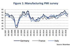 Uncertainty increased recently amid conflicting signals. Survey data softened further in July, while financing conditions remain favorable. On Tuesday, the Q2 GDP release will add an important information. Business cycle uncertainty has recently been increasing in the Euro Area. We observe downward signals from a number of cyclical indicators which conflict with a broad strength in macroeconomic trends. The first Eurostat Q2 GDP release on Tuesday 31 st July will add another indication about the state of the business cycle. The most visible downward trend in time series comes from prominent survey data. The purchase managers surveys (PMI) – both contemporaneously correlated with GDP and forward-looking – have been losing momentum since January (Figure 1). In July, the surveys for... » Weiterlesen