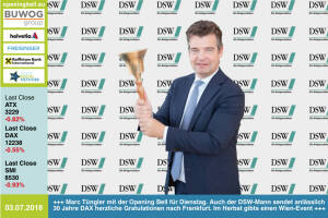 3.7.: Marc Tüngler läutet die Opening Bell für Dienstag. Auch der DSW-Mann sendet anlässlich 30 Jahre DAX herzliche Gratulationen nach Frankfurt. Im November gibt es einen grossen Event mit Tüngler, deutschen Unternehmen und dem Börse Social Network in Wien. #30jahredax www.dsw-info.de www.facebook.com groups GeldanlageNetwork #goboersewien 2.7.: Antje Erhard läutet die Opening Bell für Montag. Die Redaktionsleiterin Moderatorin bei "Der Aktionär TV" wünscht dem deutschen Leitindex DAX Happy Birthday zum 30er "Was für eine bewegende, bewegte Zeit, von der Russland-Krise über den T-Aktien-Hype und die Dotcom-Krise bis zu Donald Trump und dem Allzeithoch bei stattlichen 13.596 Punkten. Dankbar, wie viel ich davon mitbegleiten durfte. ... » Weiterlesen