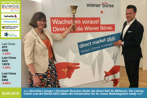 20.6..: Henriette Lininger und Christoph Boschan läuten eine direct Opening Bell für Mittwoch. Die Listing-Chefin und der Börse-CEO haben die Infrastruktur für ihr neues Marktsegment ready, siehe www.boerse-social.com 2018 06 19 die_positive_ungeduld_von_christoph_boschan_und_ein_grundsatzliches_borse-yes_von_den_oekostrom-eigner_gabb http: www.wienerborse.at www.facebook.com groups GeldanlageNetwork #goboersewien 19.6.: Jürgen Wahl mit der Opening Bell für Dienstag. Er läutet damit sein EXAA-Sommerfest (findet diese Woche satt) und die in Produktion befindliche "Power-Nummer" des Börse Social Magazine ein www.exaa.at http: www.boerse-social.com magazine www.facebook.com groups GeldanlageNetwork #goboersewien 18.6.: Dieter Kraßnitzer ... » Weiterlesen