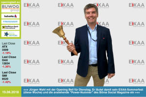 19.6.: Jürgen Wahl mit der Opening Bell für Dienstag. Er läutet damit sein EXAA-Sommerfest (findet diese Woche satt) und die in Produktion befindliche "Power-Nummer" des Börse Social Magazine ein www.exaa.at http: www.boerse-social.com magazine www.facebook.com groups GeldanlageNetwork #goboersewien 18.6.: Dieter Kraßnitzer mit der Opening Bell für Montag. Der Vorstandsdirektor der BKS Bank zeichnet u.a. für die Digitalisierung der seit 1986 börsenotierten Bank verantwortlich. http: www.bks.at www. facebook .com groups GeldanlageNetwork #goboersewien 15.6.: Alexandra Rosinger und Gregor Rosinge r läuten die Opening Bell für Freitag und rufen die Finanzszene zur Teilnahme am heute startenden Blogwettbewerb "Novomatic Smeil Alps 2018" auf... » Weiterlesen