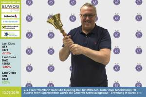 13.6.: Franz Wohlfahrt läutet die Opening Bell für Mittwoch. Unter dem scheidenden FK Austria Wien-Sportdirektor wurde die Generali-Arena ausgebaut - Eröffnung in Kürze www.facebook.com groups Sportsblogged 12.6.: Andreas Bayrhofer läutet die Opening Bell für Dienstag. Der Fonds-Profi der Sparkasse Herzogenburg-Neulengbach sucht nach Veranlagungslösungen für seine Kunden www.facebook.com groups GeldanlageNetwork #goboersewien 11.6.: Mick Knauff läutet die Opening Bell für Montag. Er berichtet täglich live aus dem Frankfurter Handelssaal für TV und Radio sowie für sein neues Projekt: http: aktienlust.tv www.facebook.com groups GeldanlageNetwork #goboersewien 8.6.: Rolf Majcen läutet die Opening Bell für... » Weiterlesen