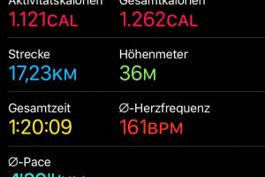 Ein schöner Mittagslauf 80 Minuten. Windig war es, aber es ist recht gut gegangen, die Pace 4:39 hat sich gut angefühlt, ich habe dabei gute Musik gehört und überlegt, wie ich das Training zum HM in 89 Minuten am besten strukturiere. Das wäre Pace 4:16. Ich werde jetzt bald mal 14k in 4:16 probieren, mal sehen, wie sich das anfühlt. Aktivität: Lauf Dauer: 01:20:09 Distanz: 17 230 Pace: 04:39 km h: 12.90 Schuhe: Brooks App: Runplugged Uhr: Apple Watch Runkit rechnet: Christian ist im Mai bisher 70,712 km gelaufen, im Schnitt täglich 4,159 km, ein Minus von 34,38 Prozent gegenüber dem April, als Christian 6,338 km Tagesschnitt hatte. Christians Top-Monat bisher: Juli 2017 mit 10,433 km täglich. >> Zum Runkit Prof... » Weiterlesen