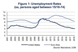 The unemployment rate in the Euro Area (8.5 %) is twice as high as in the United States (4.1 %). Labor markets in Spain and Italy continue to contribute substantially to Euro Area aggregate unemployment. Euro Area labor force participation rates are rising, while the US participation rate has declined moderately. Euro Area old age participation rates are on the rise but still below US levels. Labor markets have become substantially tighter with unemployment rates below, or close to, their pre-crisis lows. In March, the saisonally adjusted (sa) unemployment rate was at 4.1 % in the United States, covering persons aged between 16 and 74 years. The Euro Area, however, shows a considerably higher unemplyoment rate at 8.5 % (sa, February) for the same age group. Figure 1 shows that the unemploym... » Weiterlesen