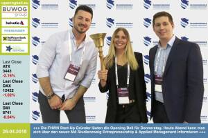 26.4. Die Fachhochschule Wiener Neustadt Start-Up Gründer läuten die Opening Bell für Donnerstag. Heute Abend kann man sich über den neuen MA Studienzweig Entrepreneurship & Applied Management informieren. Alle Infos unter www.fhwn.ac.at FHWN Events 2018 04 26 Bachelor--MasterInfoabend www.facebook.com groups GeldanlageNetwork #goboersewien 25.4. Adrienne Steindl läutet die Opening Bell für Mittwoch. Die zweifache TU-Absolventin ist erster weiblicher Ninja und verstärkt als Marketing & Project Expertin ab sofort das Team www.growth-ninjas.com www.facebook.com groups GeldanlageNetwork #goboersewien 24.4.: Johann Schmit , Präsident Klub der Wirtschaftspublizisten bzw. Österreichisches Wirtschaftsforum und Ex-Pressesprecher... » Weiterlesen