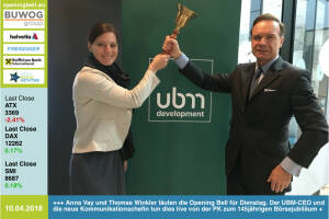 10.4.: Anna Vay und Thomas Winkler läuten die Opening Bell für Dienstag. Der UBM-CEO und die neue Kommunikationschefin tun dies live von der PK zum 145jährigen Börsejubiläum. Herzliche Gratulation! http: ubm.at www.facebook.com groups GeldanlageNetwork #goboersewien 9.4.: Thomas Schneidhofer läutet die Opening Bell für Montag. Seit bereits mehr als drei Jahrzehnten ist der Asset Manager der S-Versicherung am Wiener Aktienmarkt tätig www.s-versicherung.at de home www.facebook.com groups GeldanlageNetwork #goboersewien 6.4.: Mario Franzin läutet die Opening Bell für Freitag. Der Chefredakteur und geschäftsführende Gesellschafter des Geld Magazins berichtet seit Jahrzehnten über die Wiener Börse http: ge... » Weiterlesen