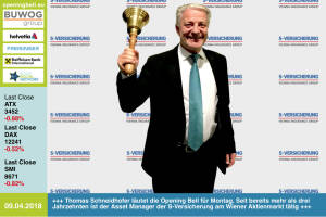 9.4.: Thomas Schneidhofer läutet die Opening Bell für Montag. Seit bereits mehr als drei Jahrzehnten ist der Asset Manager der S-Versicherung am Wiener Aktienmarkt tätig www.s-versicherung.at de home www.facebook.com groups GeldanlageNetwork #goboersewien 6.4.: Mario Franzin läutet die Opening Bell für Freitag. Der Chefredakteur und geschäftsführende Gesellschafter des Geld Magazins berichtet seit Jahrzehnten über die Wiener Börse http: geld-magazin.at www.facebook.com groups GeldanlageNetwork #goboersewien 5.4.: Herta Stockbauer läutet die Opening Bell für Donnerstag. Die Vorstandschefin der BKS erreichte 2017 einen Rekordgewinn, besonders das Wertpapiergeschäft machte ihr Freude http: www.bks.at www.facebook.... » Weiterlesen