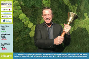 20.3.: Andreas Lichtblau läutet die Opening Bell für Dienstag. Nach dem Motto „der Garten für die Wand“ bringt er nun zusätzlich pflegefreie Moose aller Art in einer neuen Form in Innenräume http: www.wildesmoos.at www.facebook.com groups GeldanlageNetwork #goboersewien 19.3.: Monika Stoisser-Göhring läutet die Opening Bell für Montag. Die Finanzvorständin von AT&S freut sich über das Comeback der AT&S-Aktie im ATX, das mit heute effektiv ist http: www.ats.net www.facebook.com groups GeldanlageNetwork #goboersewien 16.3.: Günther Ottendorfer läutet die Opening Bell für Freitag. Der Ex-Vorstand von T-Mobile, Telekom Austira und Sprint Telecom (USA) zauberte für den neuen Börse So... » Weiterlesen
