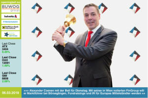 6.3.: Alexander Coenen läutet die Opening Bell für Dienstag. Mit seiner in Wien notierten FinGroup will er Marktführer bei Börsegängen, Fundraisings und IR für Europas Mittelständler werden http: www.fingroup-ag.com www.facebook.com groups GeldanlageNetwork #goboersewien 5.3.: Katharina Löckinger läutet die Opening Bell für Montag. Sie ist seit kurzem für Investor Relations Agenden bei European Lithium zuständig. Hoher Österreich-Fokus garantiert http: europeanlithium.com http: www.boerse-social.com el www.facebook.com groups GeldanlageNetwork #goboersewien 2.3.: Maresa Hoffmann läutet die Opening Bell für Freitag. Die Kommunikatorin von Wolford läutet nach dem Einstieg von Fosun Industrial Hold... » Weiterlesen