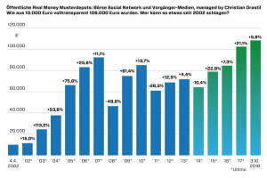 Hier anbei der erste Entwurf einer Grafik, die wir von den Farben her für das nächste Magazine noch pimpen werden. Hintergrund ist, dass ich von deutschen Börsenbriefkollegen und Agenturen immer wieder Vermarktungstipps bekomme, wie ich mit "dieser sensationellen Musterdepotperformance" Leser gewinnen könne. Von 10.000 auf 108.000 Euro in 16 Jahren . Nun ist es so, dass wir mal die Grafik gemacht haben, damit man das sieht. Erklärung zu den Farben : Die blaue Phase bis August 2013 war jene bei Brokerjet, da wurde täglich in meinem alten Börsenbrief der Stand kommuniziert per Screenshot und die Orders an die Abonnenten ausgesandt. August 2013 bin ich dann auf ein wikifolio umgestiegen, da ist sowieso alles voll transparent. Den damaligen Wert des Brokerjet-Depots na... » Weiterlesen