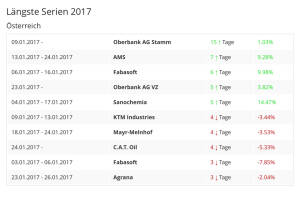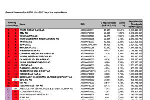 Liebe Leser!Die Wiener Börse hat die ATX-Beobachtungsliste 1 2017 veröffentlicht. Diese umfasst die Gesamtbörseumsätze 02 2016 bis 01 2017 der prime market-Werte. Siehat bereits 11 12 Bedeutung für die nächste Überprüfung im März. Und so sieht es aus:ATX-Member Do&Co ist durch Preiseffekte aus den Top 25 gefallen, es fehlt aber nicht viel.Flughafen hat die EVN überholt und ist nun auf Rang 25 beim der Market Cap, wäre derzeit im ATX. Wenn es Do&Co und Flughafen nicht in die Top-25 schaffen, gibt es einen packenden Dreikampf zwischen Mayr-Melnhof, Porr und S Immo um den Do& Co.-Platz. Alle anderen scheinen derzeit - vorbehaltlich gröberer Faktoren-Änderungen - sicher. » Weiterlesen