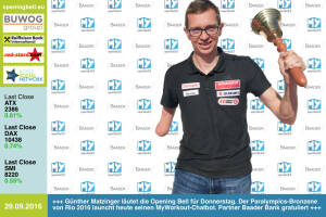 Yes! Heute läutet der grossartige Günther Matzinger unsere http: www.openingbell.eu . Günther hat unlängst bei den Rio Paralympics eine weitere Olympiamedaille geholt. Chapeau. Die Glocke schwingt er ganz bewusst heute, denn heute hat er seinen MyWorkout -Chatbot an den Start geschickt. Try it! Ich bin schon ein bissl infiziert, geb ich zu. Und dass er auch mal bei der Baader Bank AG gearbeitet hat, ist für mich persönliche Schnittmenge pur, Baader ist einer der lässigsten deutschen Geschäftsfreunde ... # openingbell Investieren in Österreich - das Geldanlage Network # somussarbeit » Weiterlesen