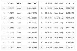 Zu folgenden News möchte ich ein bissl Senf geben ... BSN Spitouts Ranking: Apple stösst in die bessere Dow-Hälfte 2016 vor 15.09. 07:21 Ich meine: Apple hat gestern den höchsten Tagesumsatz eines Dow-Titels 2016 gehabt. Die 23 Mrd. Dollar sind etwa 2 3 des gesamten ATX-Jahresumsatzes bisher. In den Dow Top 10 findet sich nun 9x Apple und 1x Pfizer. Das deckt sich mit dem ATX: 9x Erste Group und 1x Buwog. » Weiterlesen