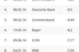 Zu folgenden News möchte ich ein bissl Senf geben ... Die zehn schlimmsten Kursvorfälle im DAX 2016 (photaq.com) Ich meine: Die RWE hat 12,42 Prozent an einem Tag verloren. Vorbörslich sieht es so aus, als könnte das beispielsweise von der Deutsche Bank, Thyssen oder VW heute getoppt werden. Ich glaube aber: Die RWE bleibt vorne am Ende des Tages und es wird zum Schlusskurs hin heute keine zweistelligen Verlierer geben. BSN Engine Auszug RWE Die RWE Aktie gewann am Donnerstag 3,06% auf 13,79 EUR. Year-to-date liegt RWE nun 17,81% im Plus. Es gab bisher 66 Gewinntage und 55 Verlusttage. Auf das Jahreshoch fehlen 0% , vom Low ist man 35,71% entfernt. Der statistisch beste Wochentag 2016 ist der Freitag mit 0,97%, der schwächste ist der Mittwoch mit -0,42%. In der Wochen... » Weiterlesen