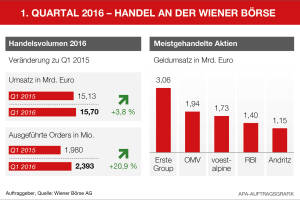 Finde es gut, dass die Börsevorstände eine Meinung zur künftigen Kursentwicklung haben ... "Wien, 4. April 2016 - Aktienumsatz steigt im 1. Quartal 2016 ggü.Vorjahreszeitraum um 3,8% auf 15,7 Mrd. EUR - Durchschnittlicher Monatsumsatz liegt bei 5,23 Mrd.EUR -Aufholpotenzial für den ATX : Performance ytd - 5,28 % - Starke Liquiditätszufuhr: 265 Betreuungsmandate von Market Maker & Specialists Der Aufwärtstrend beim Aktienumsatz an der Wiener Börse bleibt im ersten Quartal 2016 ungebremst: Das Handelsvolumen bei Beteiligungswerten liegt bei insgesamt 15,7 Mrd. EUR, ein Plus von 3,8 % gegenüber dem Vorjahr (Q1 2015: 15,1 Mrd. EUR). Der Aktienumsatz im März reiht sich mit 5,68 Mrd. EUR nahtlos an die beiden sehr starken Vormonate (01 2... » Weiterlesen