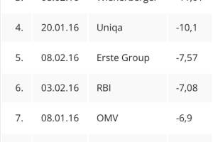 VIG verlor heute 17,93 Prozent, Immofinanz 11,45 Prozent. Damit reihen sich die beiden Titel an die Spitze der negativen Tagesperformances 2016 ein. Auch im Vorjahr waren die beide an einem Tag gemeinsam Rekorde-schreibend: Da ging es aber um die Umsätze, nicht um die Performance. Das passierte Ende Mai 2015: "MSCI-bedingt gab es heute bei Immofinanz (360,85 Mio. Euro) und VIG (267,59) extrem hohe Umsätze. Bei der VIG war dies nicht weniger als 2315% eines normalen Tagesumsatzes, bei der Immofinanz immerhin 1777%. Also quasi Monatsumsätze. Das hat auch auf die year-to-date-Umsatzsicht im ATX Auswirkungen, alles schiebt sich viel näher zusammen: http: boerse-social.com launch money atx#sort_sum_money!descending . Spektakulär ist zudem, wie sich diese bei... » Weiterlesen