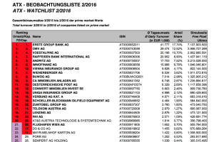 Liebe Leser!Die Wiener Börse hat die ATX-Beobachtungsliste 2 2016 veröffentlicht. Diese umfasst die Gesamtbörseumsätze 3 2015 bis 2 2016 der prime market-Werte. Es istdie für dieUmstellung massgebliche Liste. AT&S sollte wie "hochgerechnet" den ATX-Platz vom Flughafen bekommen, Wienerberger die Immofinanz im ATXFive ersetzen. » Weiterlesen