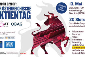 Um 11:24 liegt der ATX mit -0.30 Prozent im Minus bei 4087 Punkten (Ultimo 2024: 3663, 11.58% ytd). Topperformer der PIR-Group sind AT&S mit +4.85% auf 14.93 Euro, dahinter DO&CO mit +4.13% auf 146.4 Euro und Strabag mit +4.08% auf 80.45 Euro. Zum Vergleich der DAX: 22839 (+0.70%, Ultimo 2024: 19909, 14.71% ytd). Spoiler: #aktientag135 . Wie angekündigt outen wir nun täglich Details zum Österreichischen Aktientag am 13. Mai. Heute geht es um die Erweiterung des Slots vom Mittwoch ... Andreas Kern, CEO wikifolio : " Am 13. Mai 2025 laden Börse Social Network und Börse Express zum großen Österreichischen Aktientag! Unter dem Motto „Stock Market Company meets Private Investors“ erwartet die Besucher ein spannender Tag rund um das Thema Bö... » Weiterlesen