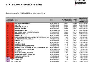 Die Wiener Börse hat gestern die ATX (TR)-Beobachtungsliste 06 2023 veröffentlicht. Diese umfasst die Gesamtbörseumsätze 07 2022 bis 06 2023 der prime market-Werte. Sie hat 10 12 Bedeutung für die nächste Umstellung im September. Die Monate Juli und August 2022 werden noch durch Juli und August 2023 ersetzt. Anm.: Erstmals ist die Telekom Austria in dieser Phase vor dem ATX-Mitglied Strabag, also virtuell im ATX. (Der Input von Christian Drastil für den http: www.boerse-social.com gabb vom 03.07.) » Weiterlesen