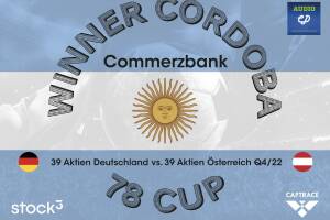 Der Cordoba 78 Cup von BSN, stock3 und Captrace ist ein Ausscheidungsrennen aus 39 Aktien aus dem DAX 40 und 39 Aktien aus dem ATX Prime41. Vor Start wurde aus dem DAX Covestro, der Titel mit der schwächsten Kapitalisierung, gestrichen und aus dem ATXPrime RHI Magnesita und Austriacard, beide haben ihr Hauptlisting an anderen Märkten. Von 22. Mai bis 21. Juni (der 45. Jahrestag des 3:2 von Ö gegen D in Cordoba Argentinien ) werden nun börsetäglich Aktien ausscheiden, die jeweils performanceschwächsten. In der Woche 1 waren es 6 Titel je Börsetag, in Woche 2 je 5 Titel und in in Woche 3 Montag bis Donnerstag je 2 Titel. Am Freitag sind 2 Titel ausgeschieden und ab seit 12.Juni täglich nur noch einer. Am 21.6. kennen wir den Sieger. Und es ist die Commerzba... » Weiterlesen