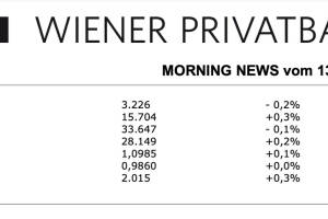 Aus den Morning News der Wiener Privatbank: "Die Wiener Börse hat den Handel am Freitag mit klaren Kursgewinnen beendet, der ATX konnte den Tag mit einem Zuwachs von 1,0% beenden, was für die gesamte Woche gesehen eine Verbesserung von 1,6% bedeutete. Für deutlichen Auftrieb beim wichtigsten Aktienbarometer in Österreich sorgten nach einem gemächlichen Vormittagsgeschäft die Rekordergebnisse einiger US-Großbanken, in deren Windschatten ging es auch für die Wiener Bankaktien, die im ATX stark gewichtet sind, deutlich nach oben. So konnte die Bawag satte 2,7% höher schliessen, für die Erste Group ging es sogar um 2,9% nach oben und die Raiffeisen Bank International erzielte einen Anstieg von 1,5%. Auch die Immobilienwerte waren gesucht und entwickelten sich... » Weiterlesen