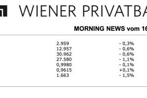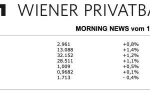 Aus den Morning News der Wiener Privatbank: Die heimische Börse konnte mit klaren Aufschlägen in die neue Woche starten und den Elan der Vorwoche mitnehmen, der ATX endete mit einem Zuwachs von 2,4% und verbuchte damit bereits den vierten Gewinntag in Folge. Schon über Nacht waren positive Impulse durch die starken Börsen in Asien gekommen, mit der positiven Eröffnung in den USA kam noch einmal zusätzlicher Schwung in den Handel. Impulsgebende Konjunkturdaten waren hingegen Mangelware, auch von der Unternehmensseite gab es so gut wie keine signifikanten Meldungen. Weiter sehr gesucht waren die großen Bankenwerte, die somit erheblich zur guten Entwicklung des Index beitrugen, für die Bawag gab es einen Anstieg von 1,3%, die Erste Group konnte sich gleich um 4,4% ver... » Weiterlesen