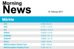 Investoren üben sich immer mehr in einem (gerechtfertigten) Optimismus, auch gestern ging es mit den europäischen Börsen weiter leicht nach oben. Getrieben von den guten Vorgaben aus den USA und einer weiteren Ankündigung von Präsident Trump, etwas „Phänomenales“ in Sachen Steuersenkung und Deregulierung zu schaffen, konnten die wichtigsten europäischen Börsen den Tag mit Zuwächsen beenden. Wieder einmal sehr stark der Bankensektor, getrieben von der Hoffnung auf bald steigende US-Zinsen. Deutsche Bank konnte 2,5% höher schließen, die Commerzbank stand nicht viel nach mit einem Plus von 2,1%. Lufthansa hat nach 14 Streiks endlich eine erste Teillösung mit der Pilotengewerkschaft erreicht und konnte knapp 1,7% dazugewinnen. ... » Weiterlesen