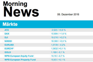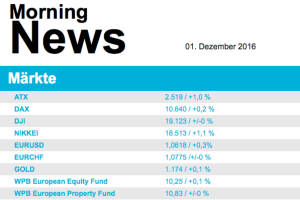 Die Zurückhaltung vor dem Verfassungsreferendum in Italien am Sonntag sorgte gestern für Abgaben. Überwiegend gut ausgefallene US-Konjunkturdaten setzten dagegen keine stützenden Impulse. Besser als erwartet fielen der Markit- und der ISM-Einkaufsmanagerindex für das Verarbeitende Gewerbe (53,2, erwartet waren 52,5) im November aus. Auch in der Eurozone gab es erfreuliche Daten, so ging die Arbeitslosenquote im Oktober auf 9,8% zurück (erwartet wurden 10%, das Vormonat wurde von 10% auf 9,9% hinunterrevidiert). Damit setzt sich der Trend der Erholung des Arbeitsmarkts in der Eurozone beschleunigt fort. Die EZB wird trotzdem weiter ihre sehr lockere Geldpolitik fortsetzen, da die Inflation noch immer sehr niedrig ist. Ölaktien setzten nach dem Opec-Beschluss ihre Rall... » Weiterlesen