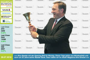 9.7.: Nico Baader mit der Opening Bell für Montag. Dieser Tage gehts um #30JahreDAX und auch um 35 Jahre seiner Baader Bank. Dazu haben wir im neuen Magazine eine mehrseitige Strecke www.baaderbank.de http: www.boerse-social.com magazine www.facebook.com groups GeldanlageNetwork #goboersewien 6.7. : Stefan Scharff läutet die Opening Bell für Freitag. Auch er gratuliert zu #30JahreDAX. Seine SRC Research lädt die Finanzsenze am 6.9. zur SRC Forum Financials & Real Estate 2018 ein Weitere Infos hier . www.facebook.com groups GeldanlageNetwork #goboersewien 5.7.; Ulrich Hanke läutet die Opening Bell für Donnerstag. Mit boersianer.info – Hankes Börsenbrief informiert er alle 14 Tage über die Geldanlage mit Schwerpunkt Aktien. Happy 30 DAX!... » Weiterlesen