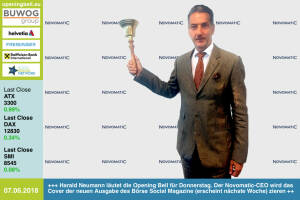 7.6.: Harald Neumann läutet die Opening Bell für Donnerstag. Der Novomatic-CEO wird das Cover der neuen Ausgabe des Börse Social Magazine (erscheint nächste Woche) zieren http: www.novomatic.com http: www.boerse-social.com magazine www.facebook.com groups GeldanlageNetwork #goboersewien 6.6.: Holger Scholze läutet die Opening Bell für Mittwoch. Der TV-Börsenkorrespondent & Moderator ist bekannt für seine lebendigen Marktberichte und kompetenten Analysen http: www.holger-scholze.de www.facebook.com groups GeldanlageNetwork #goboersewien 5.6.: Patrick Sokolovsky läutet die Opening Bell für Dienstag. Der Börsenhändler ist Founder & CEO von Onstex, dem neuen Handelsbüro im DC Tower, in dem auch Private traden k... » Weiterlesen