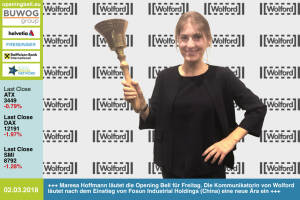 2.3.: Maresa Hoffmann läutet die Opening Bell für Freitag. Die Kommunikatorin von Wolford läutet nach dem Einstieg von Fosun Industrial Holdings (China) eine neue Ära ein http: www.wolford.com www.facebook.com groups GeldanlageNetwork #goboersewien 1.3.: Klaus Gerdes läutet die Opening Bell für Donnerstag und damit auch den März. Der Vorstand Sanochemias lieferte 2018 die bisher beste Aktienperformance aller Austro AGs http: www.sanochemia.at .Sanochemia war gestern auch Teilnehmer bei der Roadshow #75 , siehe Präsentation unter http: www.boerse-social.com page index 3423 , Bilder zum Event unter http: www.boerse-social.com page index 3427 www.facebook.com groups GeldanlageNetwork #goboersewien 28.2.: Sandra Hengstermann läutet ... » Weiterlesen