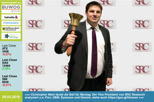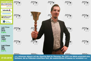 27.2.: Johannes Allesch läutet die Opening Bell für Dienstag. Der CEO von MAIA entwickelt eine Software, die es Patienten erleichtern soll, die medizinischen Prozesse zu verstehen http: www.maia.tools www.facebook.com groups GeldanlageNetwork #goboersewien 26.2.: Christopher Mehl läutet die Opening Bell für Montag. Der Vice President von SRC Research analysiert u.a. Porr, UBM, Eyemaxx und Demire, siehe auch goo.gl Uhxexe http: www.src-research.de www.facebook.com groups GeldanlageNetwork #goboersewien 23.2.: Maximilian Schausberger läutet die Opening Bell für Freitag. Gestern feierte das von ihm betreute RBI Fintech Accelerator Programm "Elevator Lab" mit dem Demo Day einen Meilenestein, siehe Diashow http: www.photaq.com page index 3420 http: ... » Weiterlesen